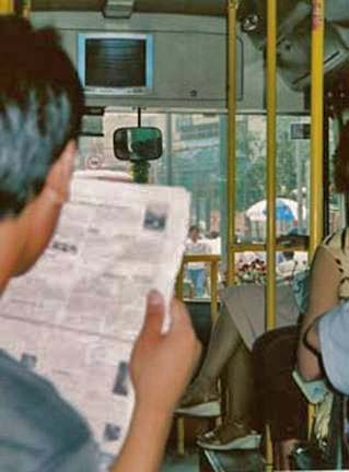 [below, right]: Passengers are entertained with a television at the front of the bus.
