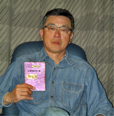 Mr. Mito Kosei [shown to the left, holding his Certificate] explains about "A-bomb survivor's health book" Certificates. The first photo below shows the cover of the certificate of his mother, Mrs. Mito Tomie and the other two show his and his mother's certificates. The first certificate says, "Tomie belongs to the second class" and the second says "Kosei belongs to the fourth class."
