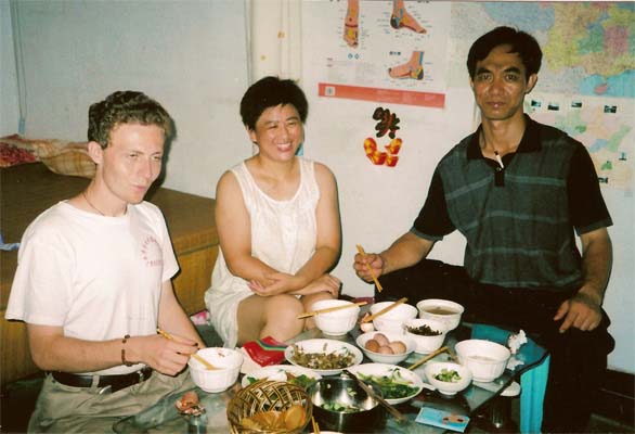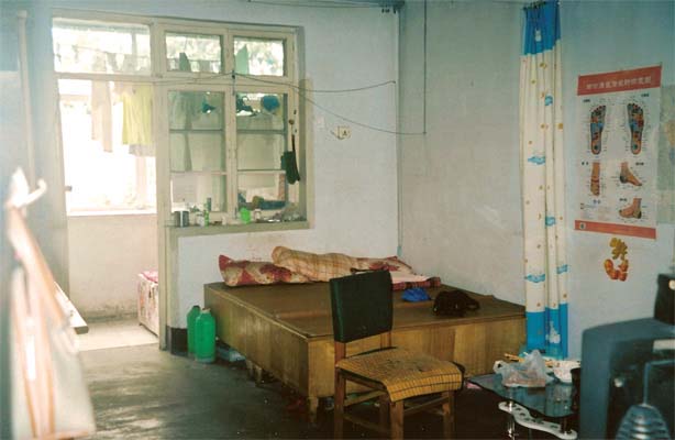 Excerpted from the Diary from China: What an experience [the laundry was]! They have a washing machine with two parts – on the left is a small cylinder that fills with water, you add the detergent, and it agitates the clothes for whatever length of time that you set. You take out those clothes without draining the water and add the next batch, let it agitate those clothes and so on, putting the darkest clothes in last. Meanwhile, as you pull the cleaned, soapy clothes out, you go into the bathroom (about 4 feet wide and 8 feet deep with an oblong ceramic hole set in concrete – the floor of the entire apartment is concrete, as is the floor of most homes we've visited --- plus a shower head above and a spigot on the back wall) and put a stool with a basin under the spigot and straddle the hole while you rinse the clothes thoroughly. You then take the rinsed clothes back to the washing machine and put them into the smaller cylinder on the right. That cylinder spins the clothes to wring out the water. And then you take the washed, rinsed, and spun clothes out to the back porch (8 feet deep and about 15 feet wide) which doubles as a guest bedroom (where their son fell asleep last night when Stephan and Master Sun worked on the book in the living room which doubles as his bedroom) and hang them on coat hangers along the rope strung over the bed.