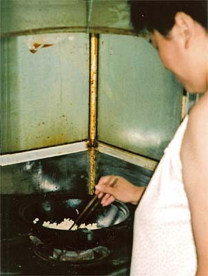 Excerpted from Diary from China: Yesterday we went to Master Sun's home in the morning and he and Stephan worked on the book while his wife Chow Jew and I [made] dumplings from scratch (well, all of this of course, was really Chow Jew doing it, with me just helping a little). She does everything with the simplest tools – she stir fries the finely chopped tofu with two chopsticks held just so (she taught me how to open and close them to get the best effect), and stirs the larger things with 4 chopsticks held flat like a tight fan. The rolling pin looks like mine when the handles fell off years ago – a simple heavy wooden rod – and she does magic with it, rolling out perfect circles of dough. The result (vegetarian, natch!) was delicious – dumplings boiled for our lunch, and then fried later for dinner.