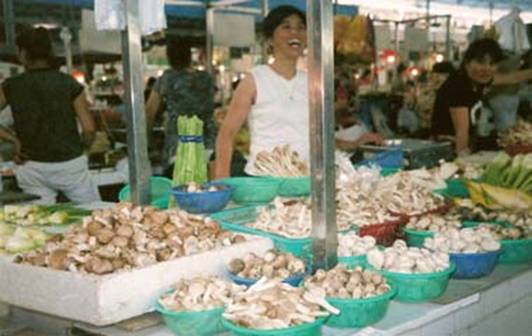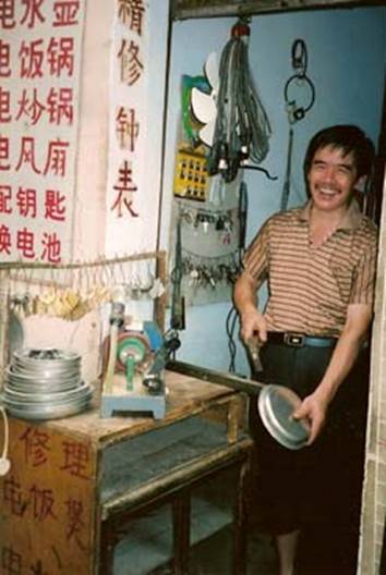 Excerpts from the Diary: So this morning young Fan took me to the market a few blocks from home, and who did we run into there? Grandma, getting the supplies for today’s feasts! I got some pictures of her getting some exotic vegetables, and also, for you, Fred, I got pictures of one of the stalls where a man in a nice white lab coat was giving some kind of electric treatment to people with aching shoulders!