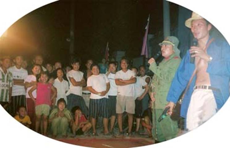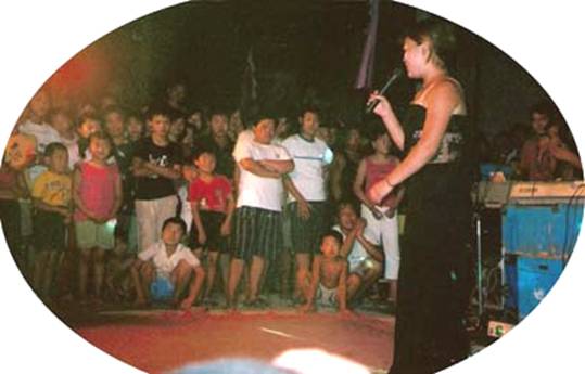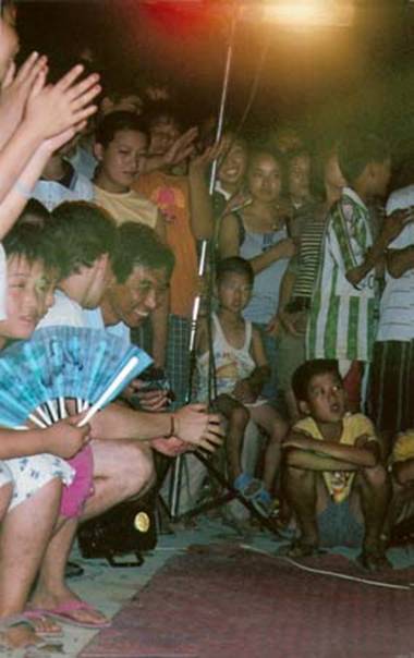 Stephan sings a song; crowds perch on the bed of a truck to get a
