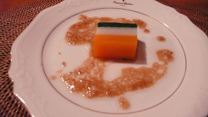 agar cube made with layers of carrots, potatoes and spinach.
