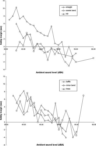 The differences between environmental conditions are exemplified by looking at average safety margins for the ambient sound level in each environmental condition (see Figure 1). Two panels are used in the figure to reduce visual clutter for the reader. In the lower panel, the baffle, minor bend, and treed conditions show similar patterns of decreasing safety margins as the ambient sound level increases. At about 50 dBA, the average safety margin becomes low enough to cause concern about detectability. The upper panel shows that the average safety margin in the straight condition consistently remains positive up to about 52 dBA. However, detection at the severe bend and hill conditions degrades at much lower sound levels. The severe bend showed an average negative safety margin at 38 dBA, while the hill began showing negative average safety margins as low as 43 dBA.