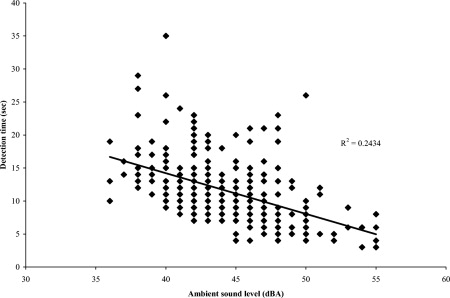 We analyzed the effect of ambient sound level, vehicle sound level, and vehicle speed on detection time more closely. To do so, we used only the data from the straight roadway (without the baffle). This environmental condition had no obstructions to hearing in either direction and so allowed for a clear analysis of the relative effects of ambient sound level, vehicle sound level, and vehicle speed on the detection of oncoming vehicles. These 288 trials showed a strong negative relationship between ambient sound level and detection time (see Figure 2).